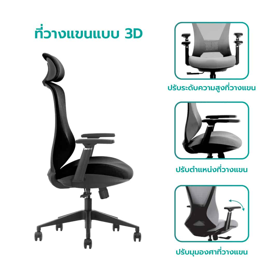 - ที่วางแขนแบบ 3D สามารถยกขึ้น – ลง เพื่อปรับระดับความสูง เลื่อนหน้า – หลัง เพื่อปรับตำแหน่งที่วางแขน และปรับมุมองศาเพื่อรองรับแขนในอิริยาบถต่างๆ