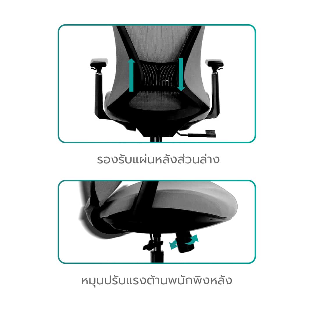 - ที่รองรับแผ่นหลังส่วนล่าง Lumbar Support ปรับระดับขึ้น – ลง ให้เหมาะกับสรีระของผู้ใช้ และช่วยให้คุณทำงานได้อย่างเต็มที่