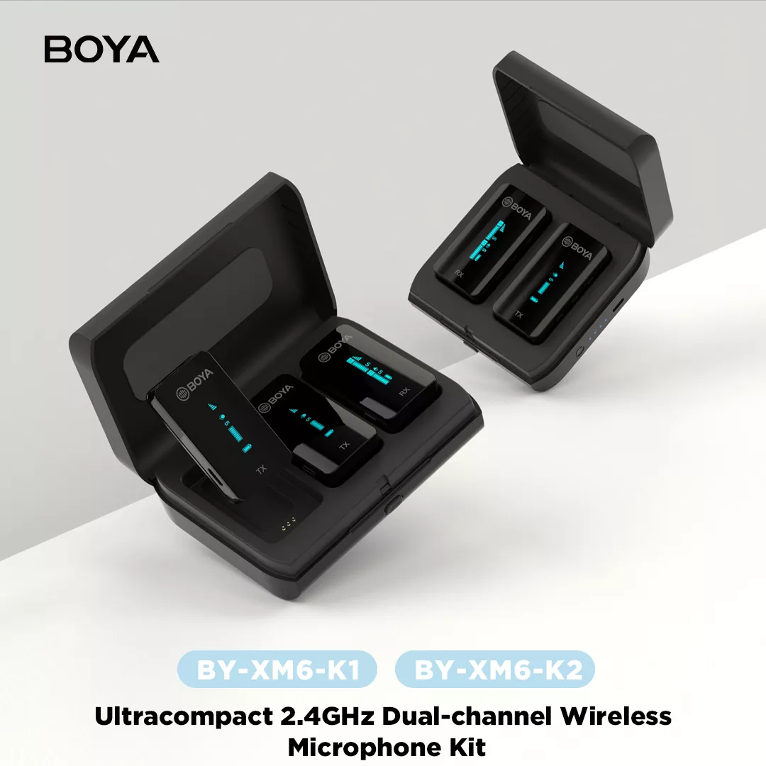 BOYA BY-XM6-K2 All-in-One Edition ซึ่งเป็นระบบไมโครโฟนไร้สายแบบกระโดดความถี่ที่ปรับได้ 2.4GHz ประกอบด้วยตัวส่งสองตัว ตัวรับหนึ่งตัว และกล่องชาร์จ เป็นการบันทึกเสียงที่สมบูรณ์แบบ ในขณะเดียวกันก็นำเสนอโซลูชันสำหรับวิดีโอบล็อกสองคน, วิดีโอ YouTube, สตรีมมิงแบบสด, การสัมภาษณ์, การบันทึก ฯลฯ