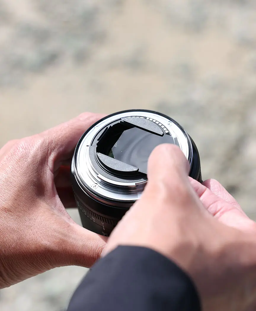 เลนส์ RF14mm f/1.4L VCM มีตัวยึดฟิลเตอร์ด้านหลังที่วางฟิลเตอร์แบบแผ่นไว้ด้านหลังเลนส์ ช่วยให้คุณถ่ายภาพมุมกว้างอัลตร้าไวด์ได้โดยไม่ต้องใช้ขอบมืด