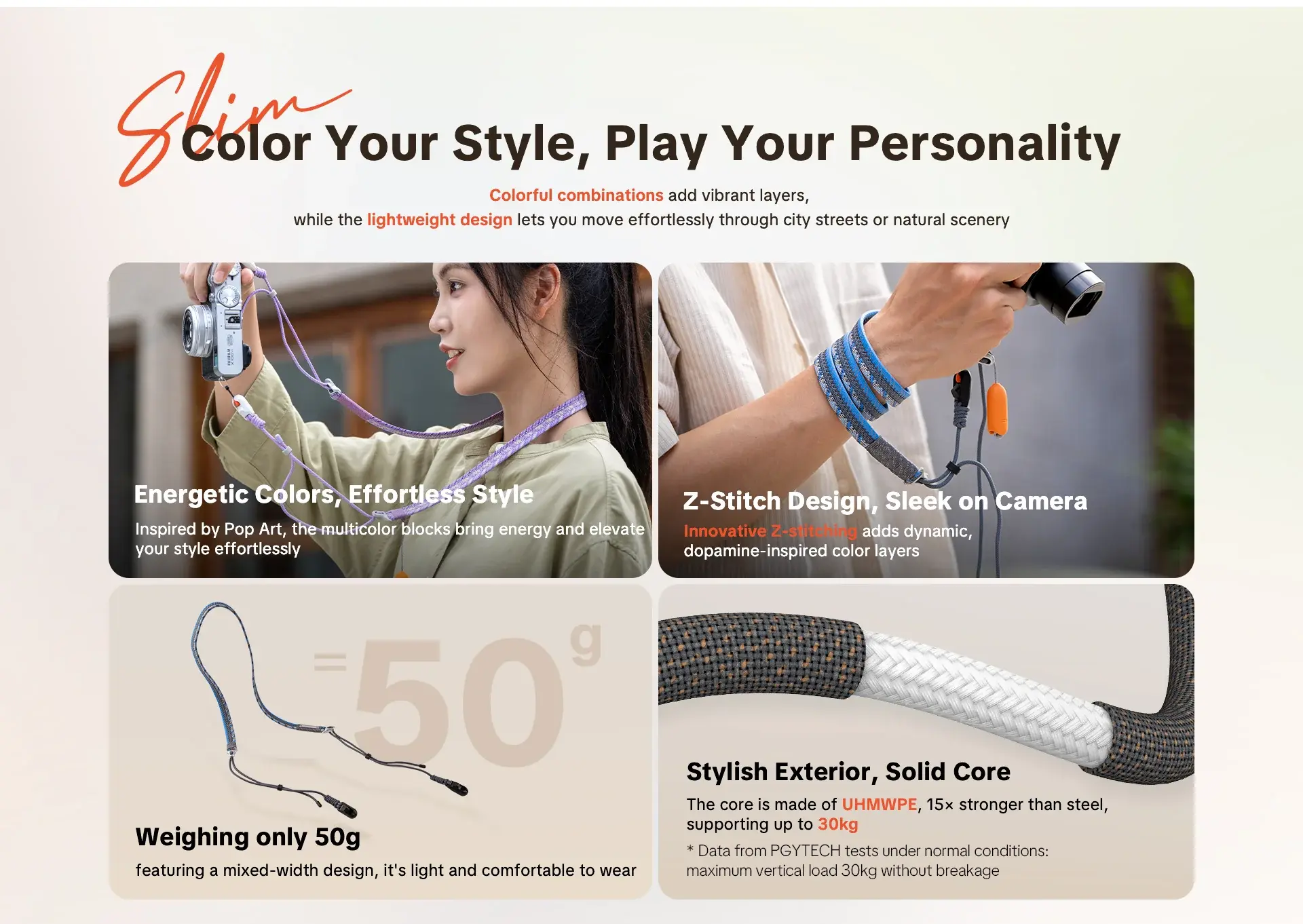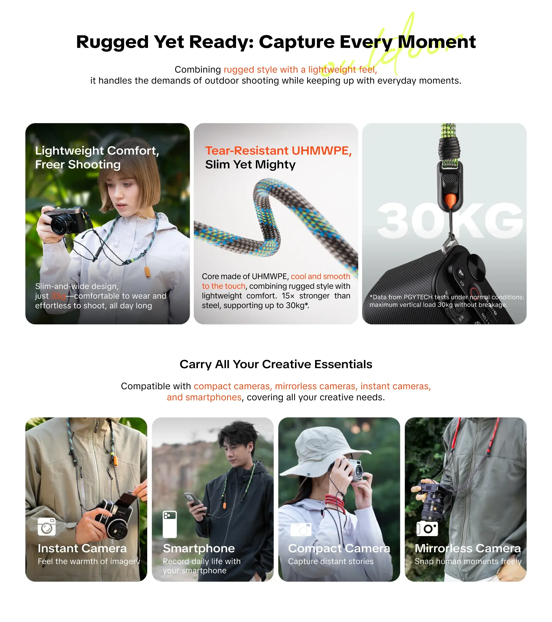PGYTECH Camera Strap Slim สายคล้องกล้องดีไซน์บางเบา แต่แข็งแกร่งด้วยแกนกลางที่ทาจากวัสดุ UHMWPE ซึ่งแข็งแรงกว่าเหล็กถึง 15 เท่า ทำให้คุณสามารถใช้งานกับกล้อง Mirrorless หรือ DSLR พร้อมเลนส์ได้อย่างมั่นใจ เป็นสายที่ออกแบบมาให้ใช้งานได้ทั้งวันโดยไม่รู้สึกเมื่อยล้า