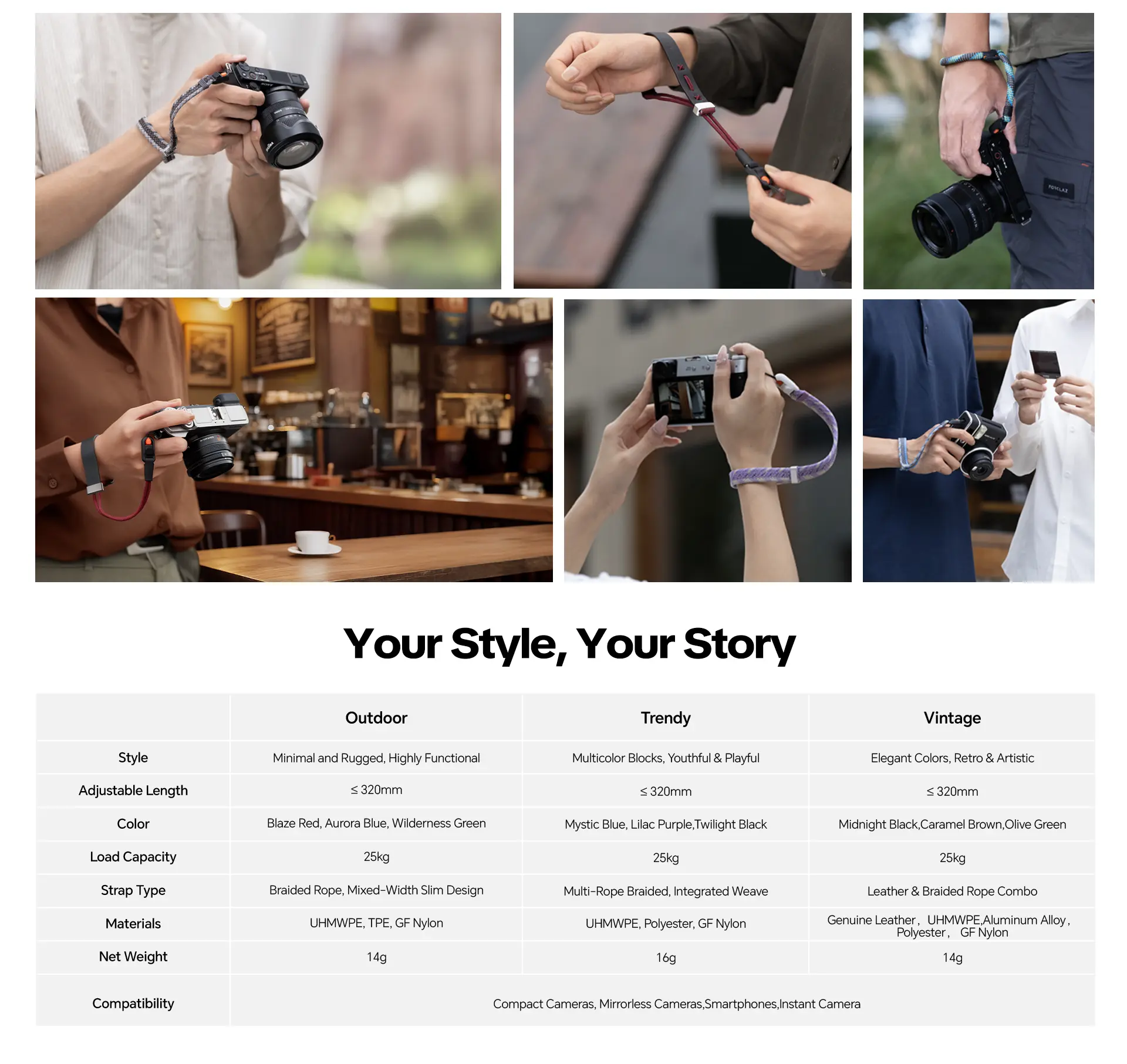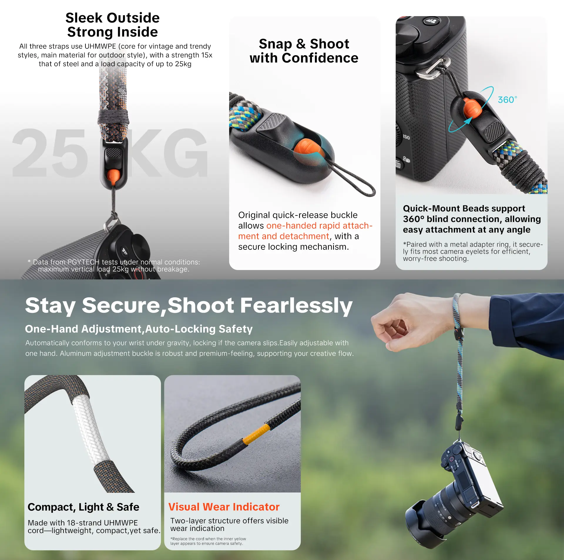 PGYTECH Camera Wrist Strap Slim เป็นสายคล้องข้อมือที่ออกแบบมาสำหรับช่างภาพที่ต้องการความ คล่องตัวสูงสุด น้ำหนักเบาแต่แข็งแรง เหมาะอย่างยิ่งสำหรับกล้อง Mirrorless, Compact หรือกล้องแนว Street ช่วยให้คุณมั่นใจว่ากล้องจะปลอดภัยโดยไม่เกะกะ มีให้เลือก 3 สไตล์ที่แตกต่างกัน